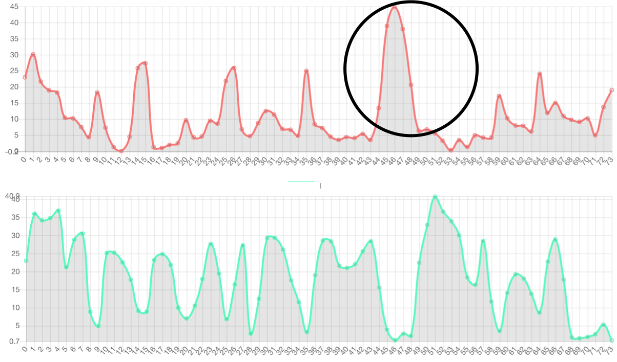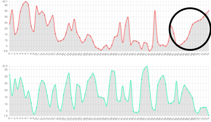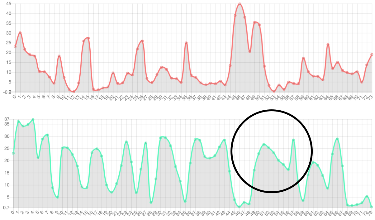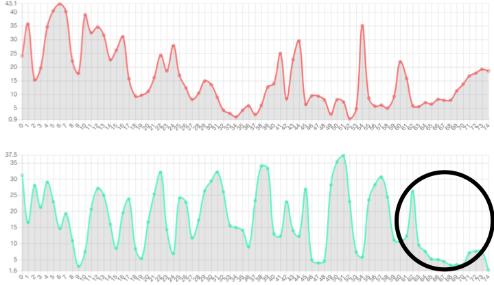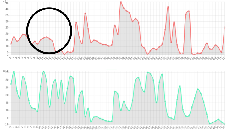 Speech-side prosody embedding can control prosody of specific frame. The red line denotes the 1st dimension of the prosody embedding. The green line denotes the 2nd dimension of the prosody embedding.