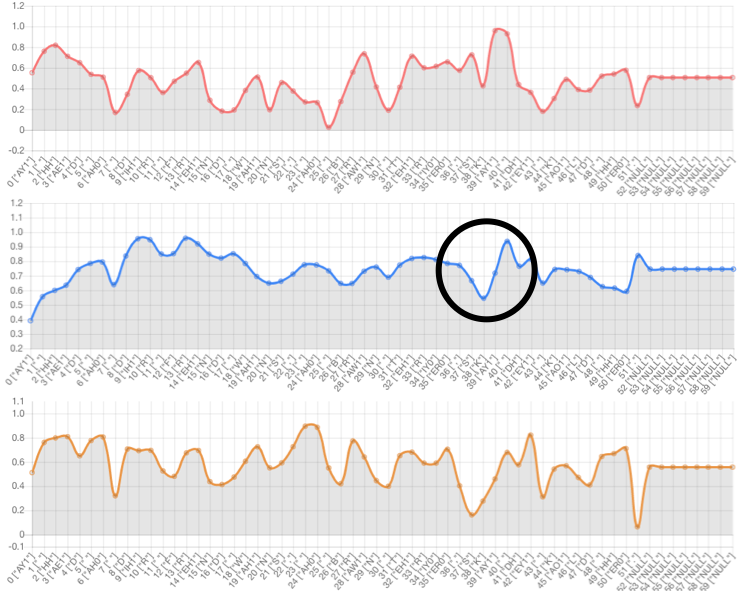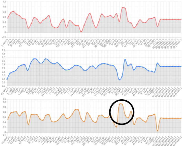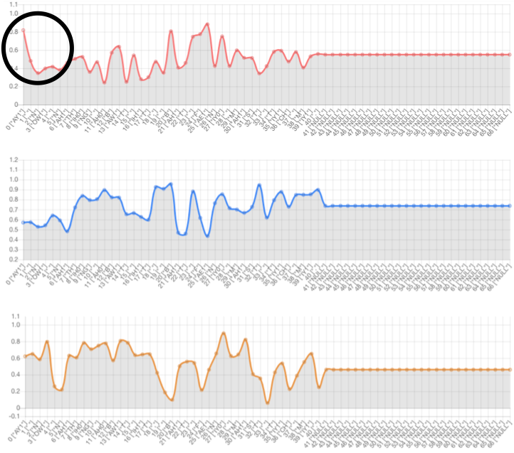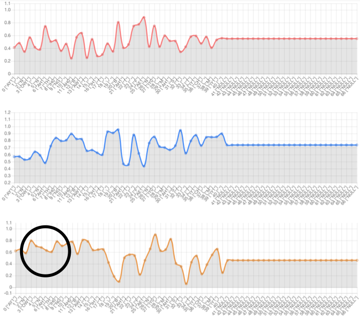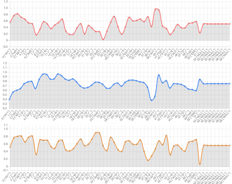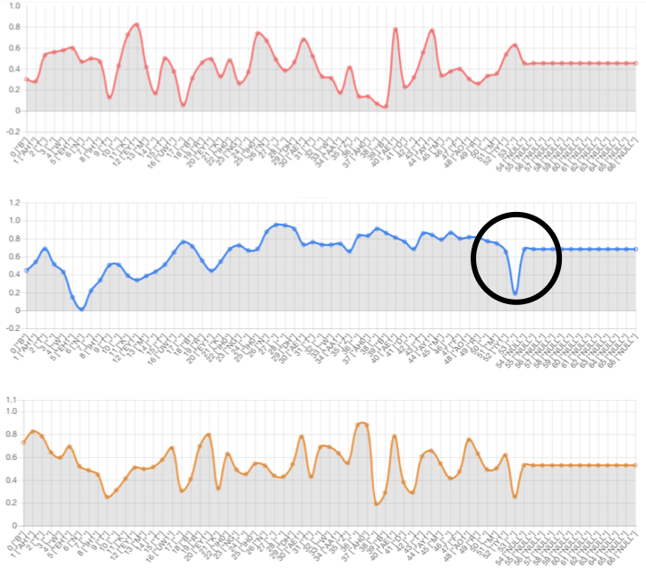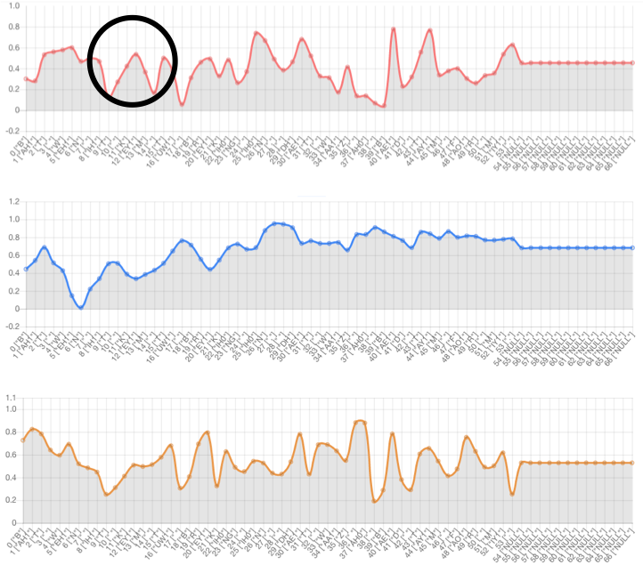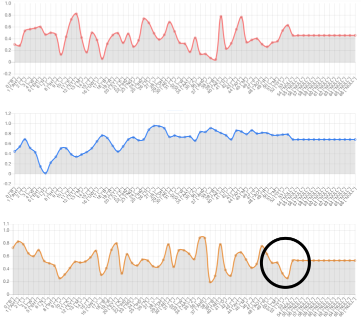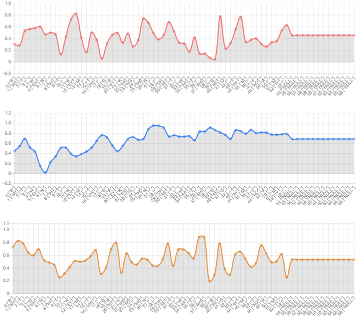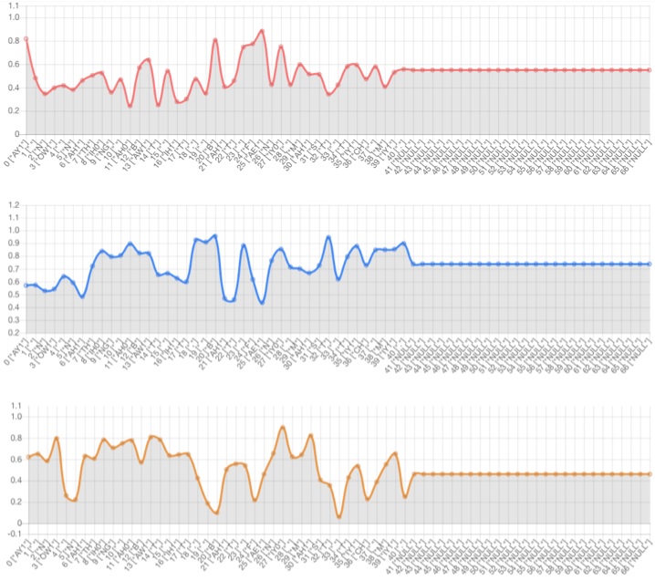 Text-side prosody embedding can control prosody of specific phoneme. The red line denotes the 1st dimension of the prosody embedding. The blue line denotes the 2nd dimension of the prosody embedding. The yellow line denotes the 3rd dimension of the prosody embedding.